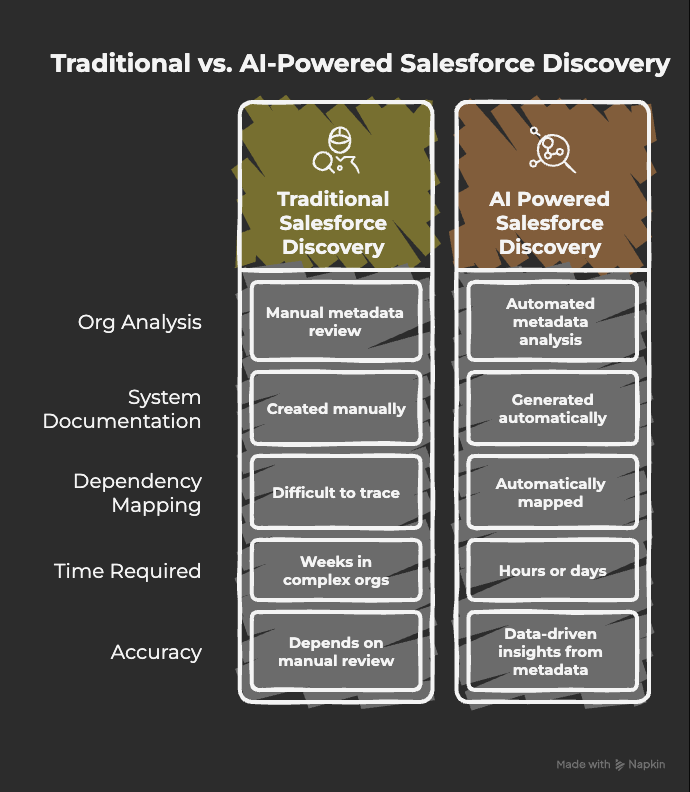 Here's a quick comparison of traditional vs. AI powered Salesforce discovery.