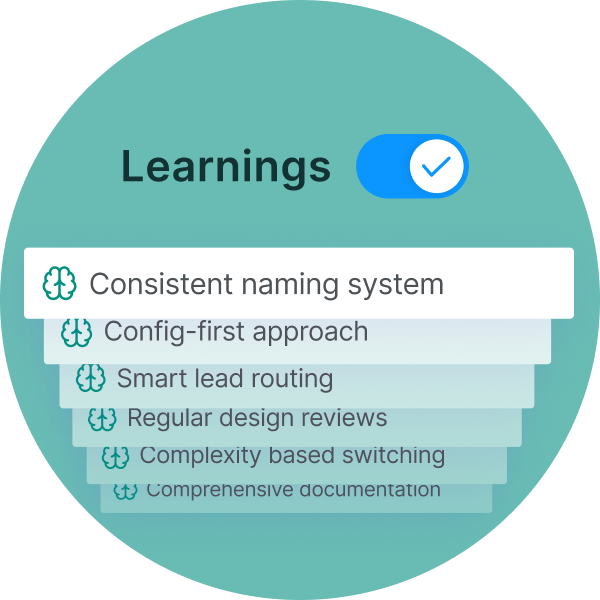 Create a persistent memory layer that becomes your Salesforce practice's standard operating procedure. Purpose-built agents learn from every project, ensuring consistent quality and best practices across all deliveries—turning tribal knowledge into repeatable competitive advantage.